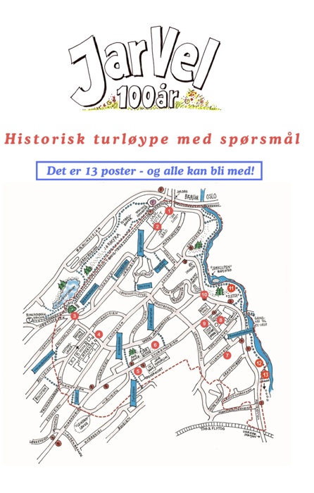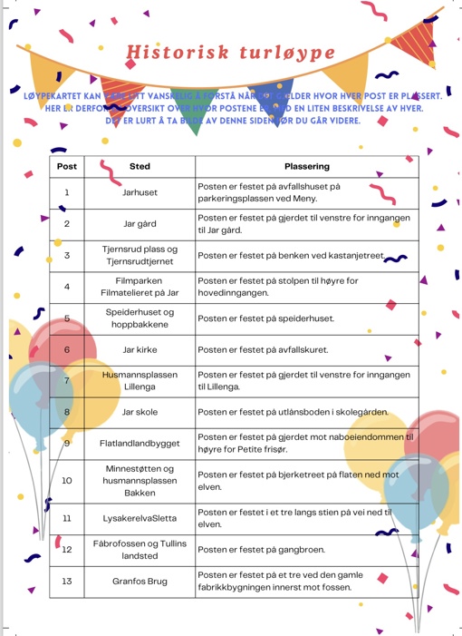 På 100-årsjubileet informerte Guri om at det nå er laget en spennende historisk løype på Jar. Dette er en vandrerute som består av 13 postkasser, fordelt rundt i nærområdet, og hver post inneholder både oppgaver og spørsmål. Svarene finner du på baksiden av arket. Løypen passer godt for både voksne og barn, og man står fritt til å velge hvordan man vil gå den – du trenger ikke ta alle postene i en bestemt rekkefølge eller gå hele løypen på én gang.