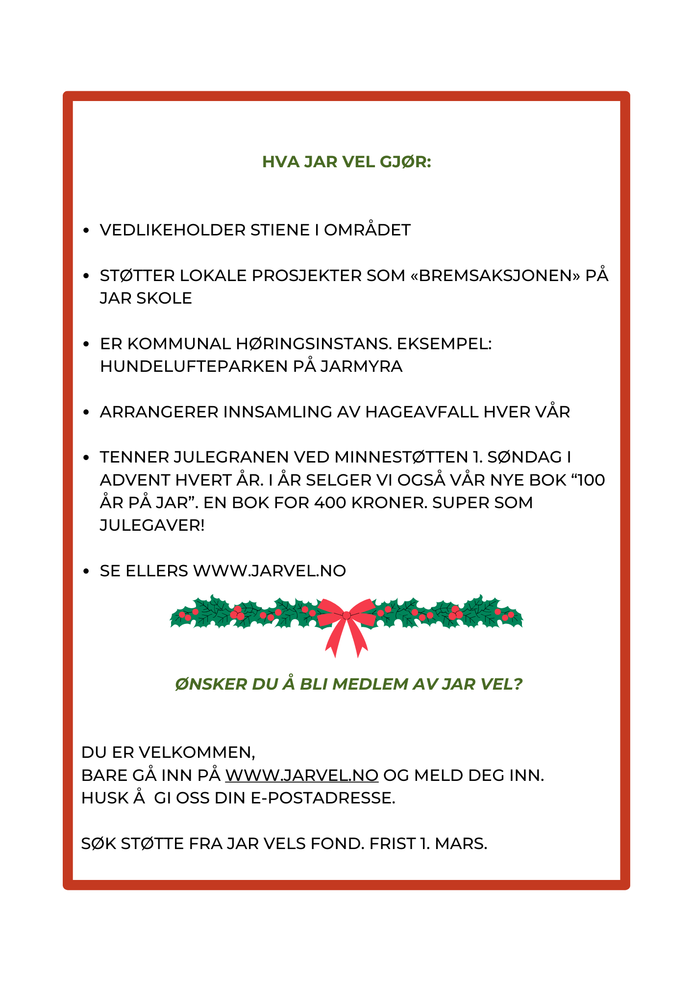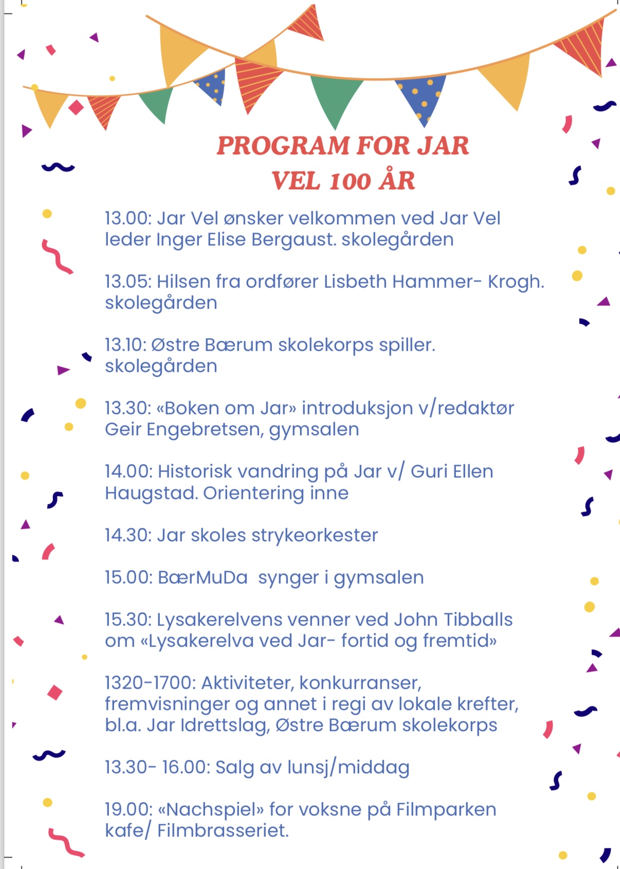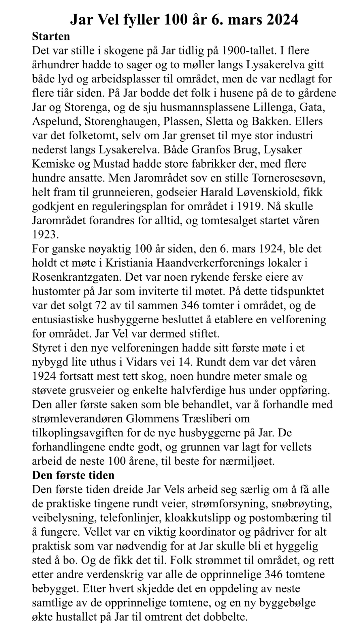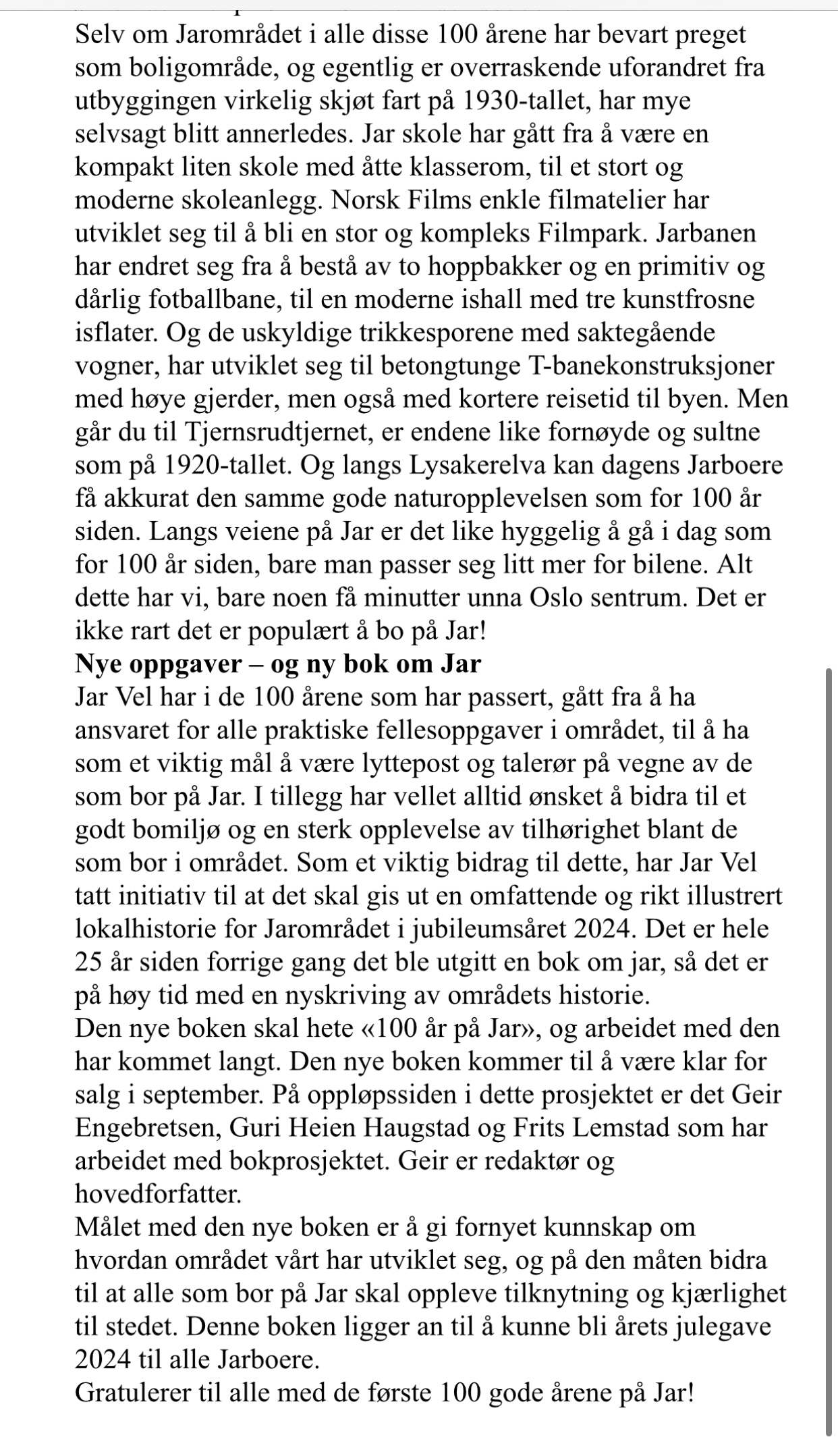 Journalist Lars Vislie Kluge og redaktør Geir Engebretsen vil fortelle om Jar-området sin historie, hvor krigsårene og utviklingen av området vil stå i fokus. Utbyggingen av Jar startet i 1924, og området ble raskt et godt og trygt boligområde. Men så kom krigen i 1940, og idyllen ble brutt på brutale måter. Hvordan var det å bo på Jar de første tiårene - og hva skjedde under krigen?