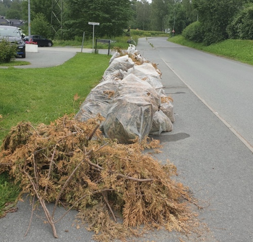 Hageavfallet skal stå lett synlig, i veikanten, utenfor port/gjerde. Bilene som henter hageavfallet er 10 meter lange komprimatorbiler, som veier ca. 20 tonn. De som bor i stikkveier som er for små for disse bilene, må derfor sette hageavfallet ut til større vei.